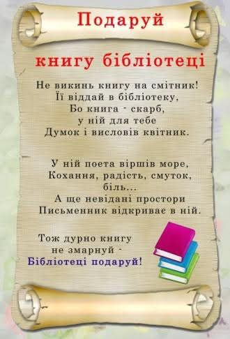 Бібліотека нашого ліцею оголошує акцію «Подаруй книгу бібліотеці», яка триватиме з 29 вересня до 10 жовтня.Запрошуємо всіх долучитися та подарувати нашій бібліотеці книги, які стануть у пригоді учням і зроблять читання ще цікавішим.Разом ми зможемо поповнити книжковий фонд і подарувати нове життя літературі. Приносьте книги до бібліотеки ліцею та станьте частиною доброї справи!